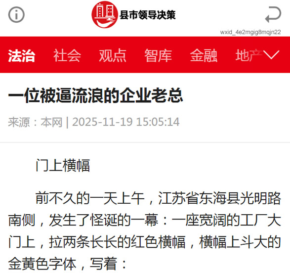 前不久的一天上午,江苏省东海县光明路南侧,发生了怪诞的一幕:一座宽阔的工厂大门上,拉两条长长的红色横幅,横幅上斗大的金黄色字体,写着: