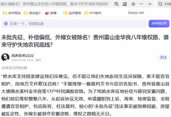 八年里,金华良等村民先后提起多起诉讼,请求确认协议无效、判令政府履行法定职责、撤销补偿决定,全程遭遇官官相护、包庇枉法裁判,均被以“不属于受案范围”“内部层级监督不可诉”“认定事实合法”等荒唐理由驳回;向贵州省人民检察院申请监督,同样未获支持;2025年信访投诉,也被以“司法程序终结”为由不予受理。他们无数次奔走反映,要求按国家与省级法定标准补足土地补偿、按市场价赔偿房屋、恢复外嫁女安置资格,却始终无人正面解决。